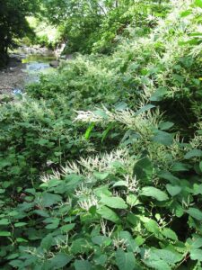 Japanese knotweed grows in dense, bamboo-like stands that can reach heights of 6–10 feet. It has large, heart-shaped leaves and produces clusters of small, white flowers in late summer. Alas, we implore you not to be drawn in by the plant’s beauty — its extensive root systems deplete nutrients in the soil, preventing native plants from regenerating. Knotweed’s presence near streams, rivers, and wetlands supports mosquito populations by creating resting habitats and breeding grounds (notably, aquatic environments treated with native plant leaves have been shown to have less larval mosquito colonization than ones treated with invasives).